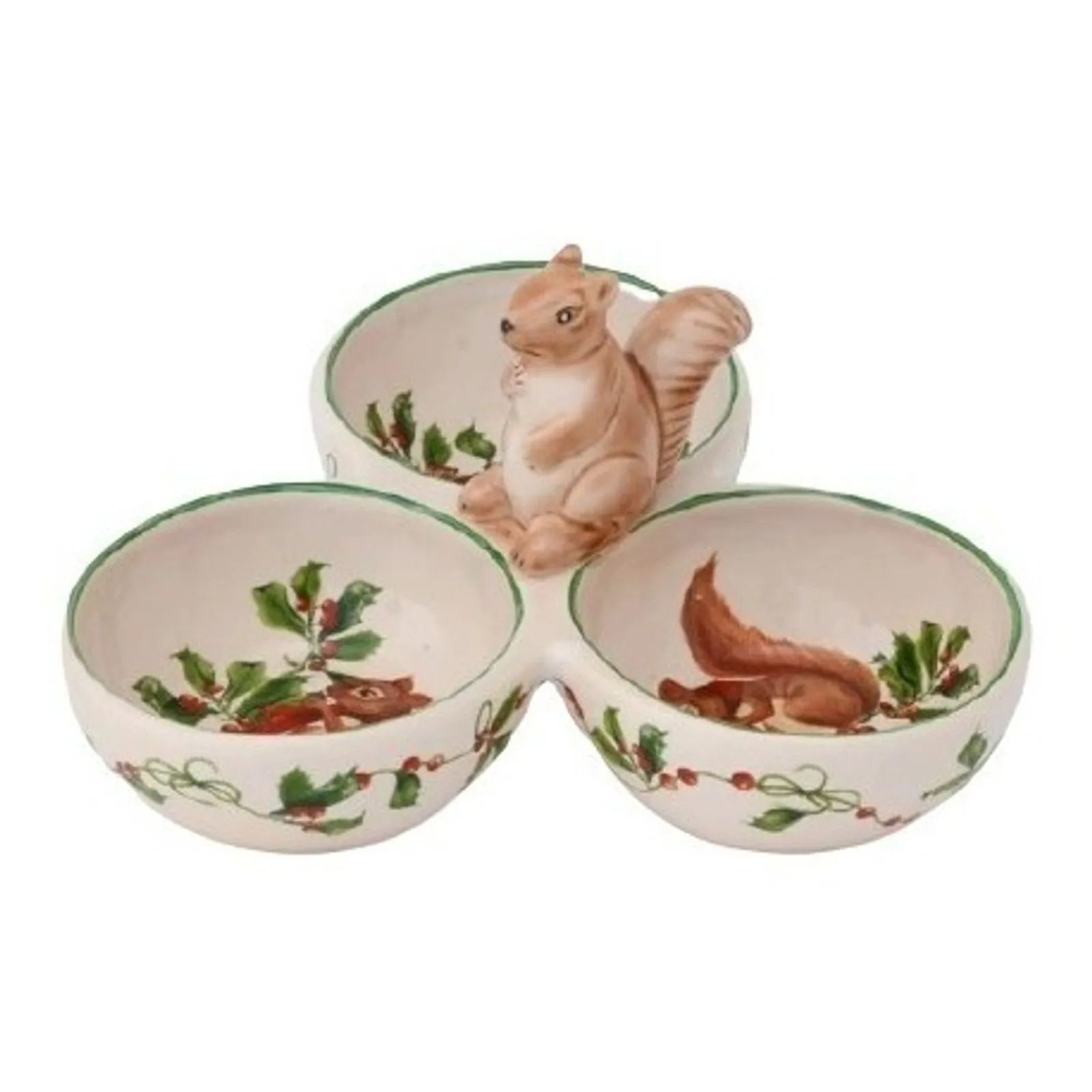 Petisqueira com 3 divisórias, centro elevado em formato de esquilo, uma peça muito linda da coleção Esquilo para complementar sua decoração.Coleção com as cores tradicionais do Natal.